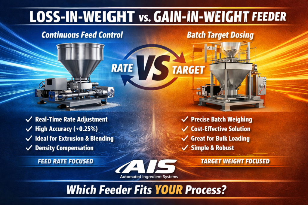 At AIS (Automated Ingredient Systems), we engineer both systems to deliver reliable, accurate material feeding for industries including food processing, nutraceuticals, chemicals, plastics, minerals, and building materials.